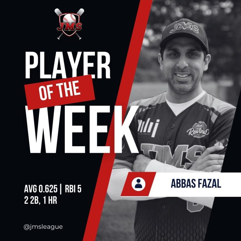 Week 8 Player of the Week JMS Men August 18, 2024August 18, 2024 Abbas Fazal claims the Week 8 Player of the Week title with a home run, 2 doubles, and 5 RBIs! He might even be gunning for GM of the Year—who knew he could manage the bases *and* the roster!